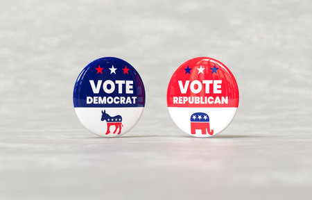 Two political campaign buttons promoting Democrat and Republican votes, featuring party symbols against a neutral background for United States of America presidential election in 3D illustration