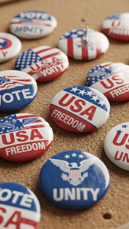 Red, white, and blue Vote pins filling the frame, election-themed background for civic engagement
