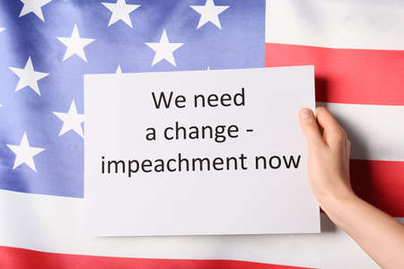 Hand holding paper with text WE NEED A CHANGE - IMPEACHMENT NOW against USA flag