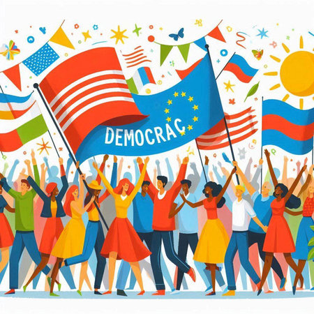 Artistic representation of the word democracy created with wood against a minimalist background evoking themes of governance and civic engagement