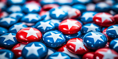 This collection of red, white, and blue campaign buttons with stars embodies American patriotism, especially during crucial election seasons that shape our nations future and democracy