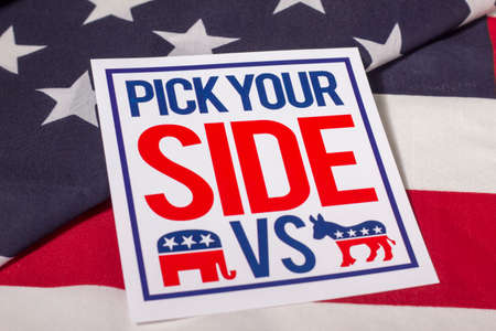 USA elections choice. Republicans, Democrats text and US flag on red and blue color background. Decision alternative for US of America election concept.