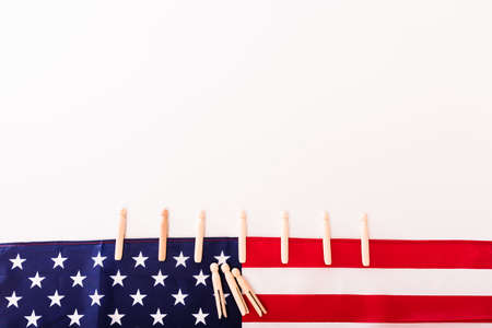 American flag fastened with clothespins on a white background, copy space for text.