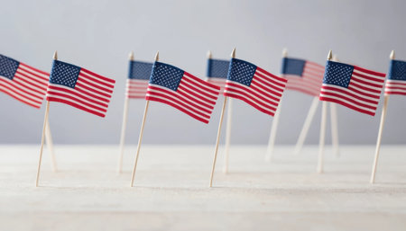 Small American flags are placed neatly on a table for President's Day event. The flags stand tall, ready for display.