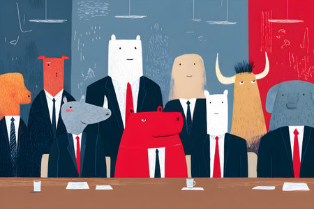 Whimsical illustration various animals in suits gathered around a conference table, creating a humorous take on corporate meetings and teamwork dynamics