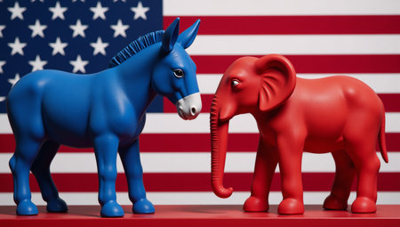 A depiction of a blue donkey and a red elephant against an American flag backdrop represents the Democratic and Republican parties for the 2024 U