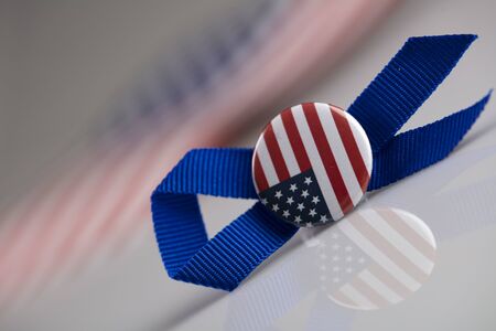 Voting badges on the background of the American flag. Selective focus.