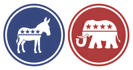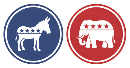Circular icons of the Democratic donkey and Republican elephant symbols in red and blue.