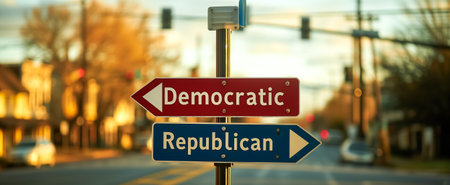 Street signs pointing in opposite directions with democratic and republican labels