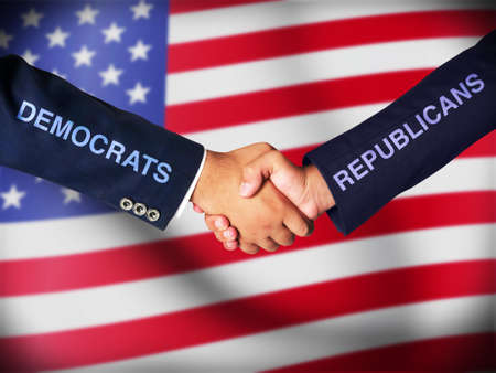 Republicans vs Democrats. Conceptual words written on wooden blocks. American flag and on the sides Republicans and Democrats. Cracked gray background, copy space, flat lay