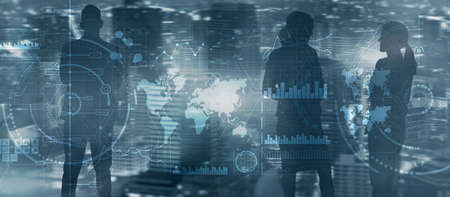 Diverse business team in city digital interface. Intelligence control panel