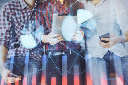 Double exposure of forex graph drawing and man and woman working together holding and using a mobile device. Trade concept.