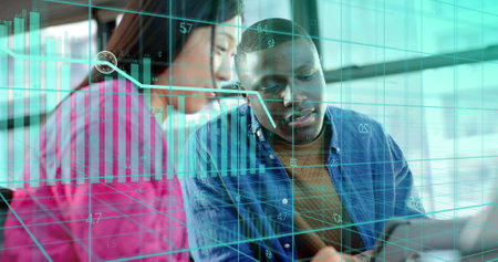 Image of financial data processing over diverse businesspeople working in office. Global business, finance, computing and data processing concept digitally generated image.