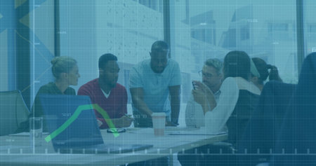 Image of data processing and diagrams over diverse colleagues discussing work. Global business and digital interface concept digitally generated image.