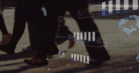 Image of graphs, globes and computer language over low section of people walking on street. Digital composite, multiple exposure, report, business, globalization, coding and technology concept.