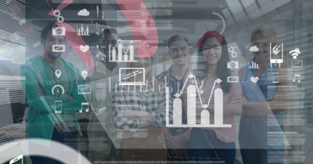 Image of network of digital icons over diverse business people. global business, finance, networking and digital interface concept digitally generated image.