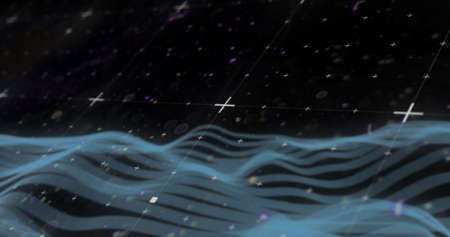 Image of glitch and crosses over blue waves on black background. shadow, pattern and colour concept digitally generated image.