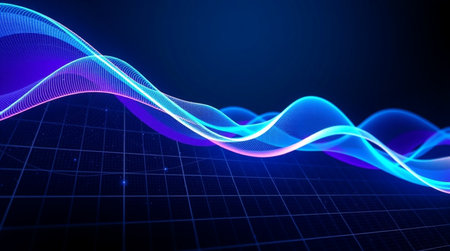 A dynamic visualization of oscillating frequency waves in a striking palette of blues, purples, and teals. This energetic background is suitable for topics related to music, technology, data, and digital communication.