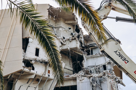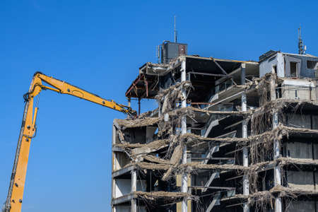An excavator at work demolishing a large multi-story building, reducing it to rubble under a clear sky. Concept of destruction, reconstruction and urban development.