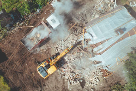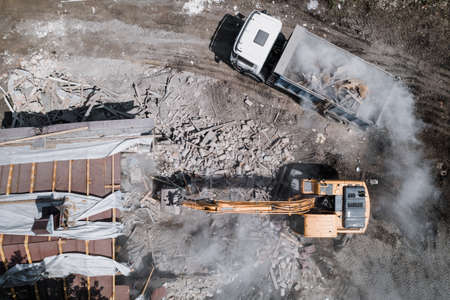 Excavator loads construction waste into truck for removal from construction site. Demolition of dilapidated housing for new development, aerial view.