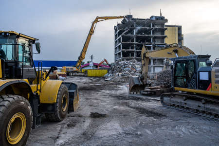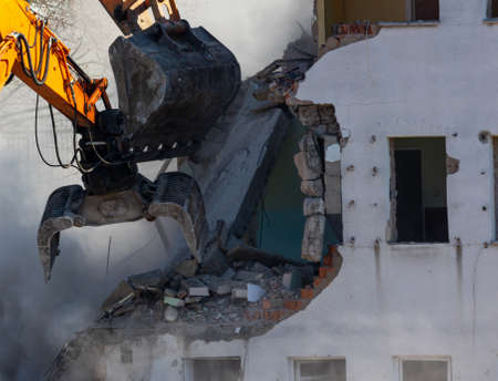 Excavator destroyer removes debris Building demolition