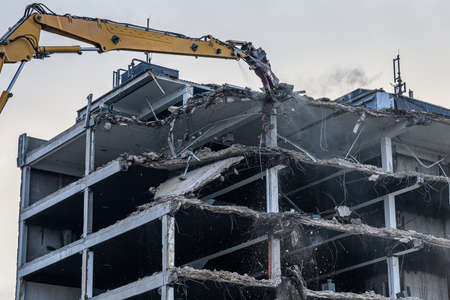mechanical destruction. Demolition crane dismantling a concrete building