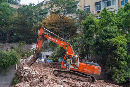 Chongqing, China - May 9, 2010: Downtown, off Peoples Square. Red Daewoo demolition crane on top of pile of stone rubble. Green foliage and yellow building in back. Workers present.