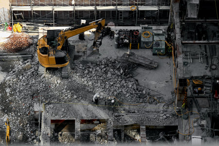 Close up view of a demolished building at a construction site