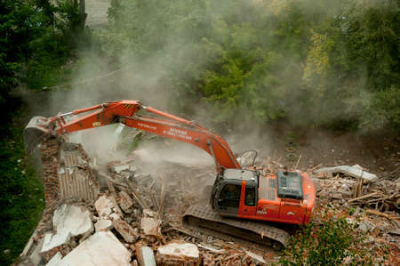 Demolition of old building with excavator working