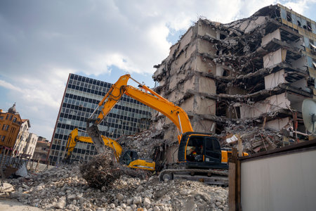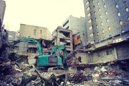 Excavators work amidst rubble, demolishing a partially collapsed building in an urban area.