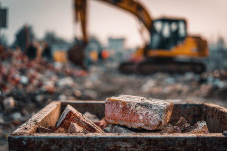 A weathered, reddish-brown container brimming with shattered bricks sits prominently, while looming construction equipment dazzles in the soft glow of sunset behind.