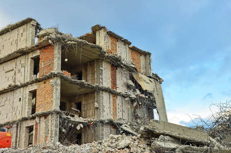 Demolition of a building with floors fragment. Destroyed structure, broken floors.