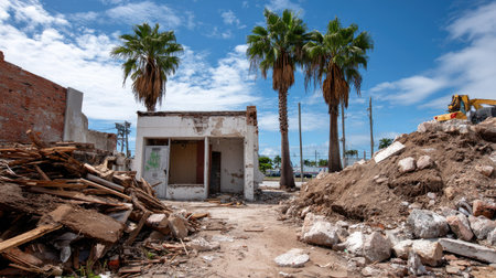 A view of a demolished building site featuring scattered debris and palm trees under a bright blue sky, showcasing urban transformation and potential redevelopment.
