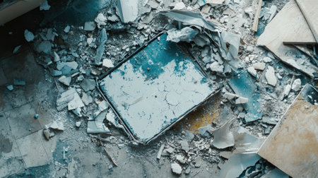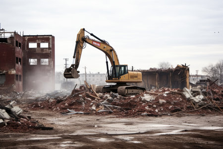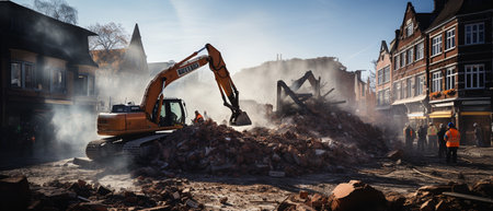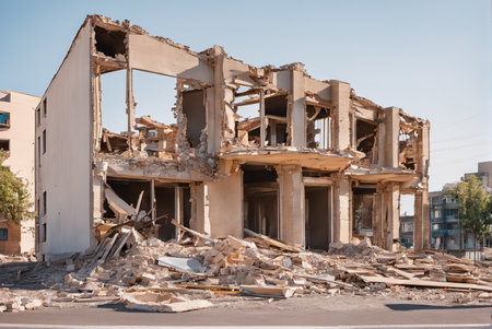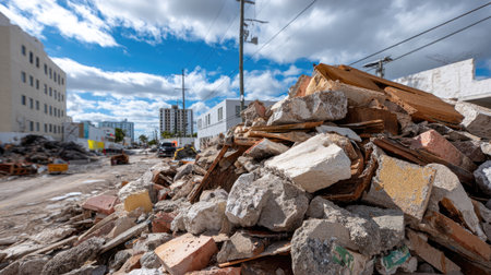 AI Generated. Demolished building debris poses hazard on ground