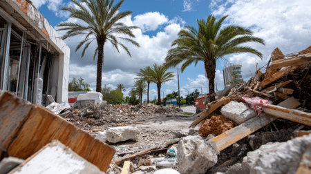 A striking image of urban devastation showcasing broken concrete and debris in front of tall palm trees under a vivid blue sky. The scene depicts the stark contrast between nature and human construction.