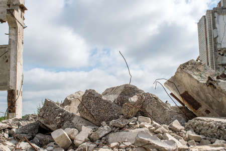 Grey concrete fragments of the Foundation against the background of a destroyed building against the sky. Background