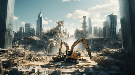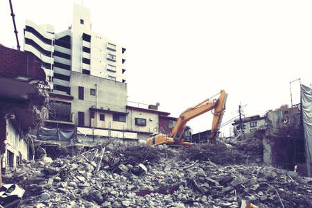 Demolition site for rebuilding city buildings using shovel cars