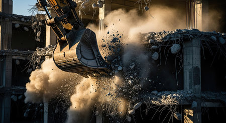 An excavator actively demolishing a building, surrounded by dust and debris, highlighting construction and demolition work.