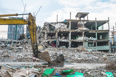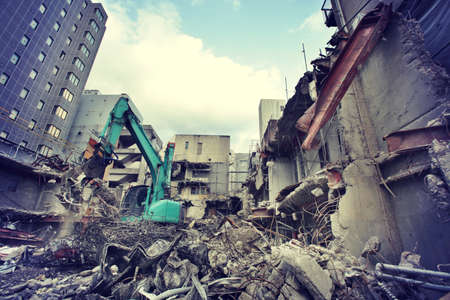 Demolition site of a city building by an excavator