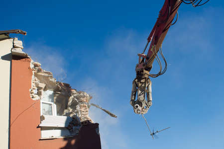 Building House destruction Demolition site Excavator with hydraulic crusher machine ruin house.