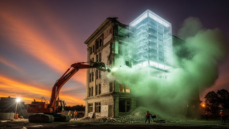 A construction site featuring heavy machinery and debris, highlighting ongoing renovation and the building process under a dynamic sky.