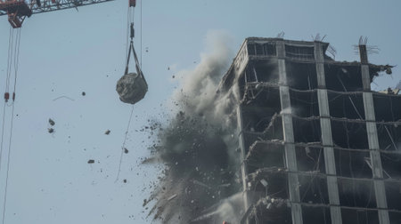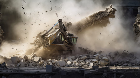 An industrial excavator machine actively demolishes a concrete building, generating a substantial plume of dust and rubble. This scene captures the raw power of heavy machinery at work on a demolition site.