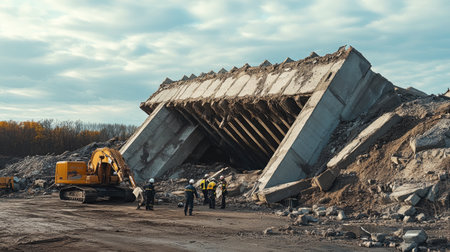 A rescue team inspects the remains of a collapsed concrete structure, carefully navigating the debris to search for survivors, highlighting emergency response efforts