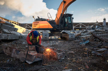 Professional demolition of reinforced concrete structures using industrial hydraulic hammer. Rods of metal fittings. Wreckage and crumbles of concrete.