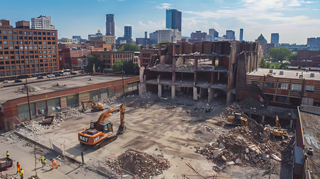 Old factory site being torn down for new construction, construction site close to pavement under sunshine, Ai generated