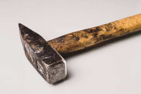 Close up view of dirty head metal hammer on with natural light and shadow. Consist of a weighted head fixed to a long handle that is swung to give an impact to small area of an object.