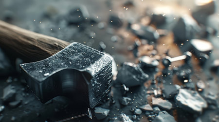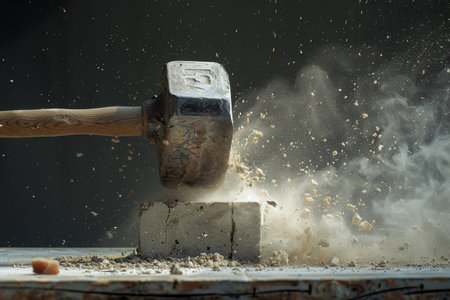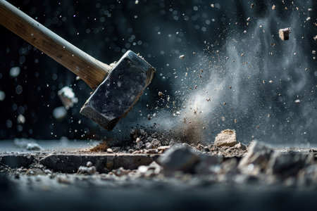 A powerful hammer crashes down with explosive force, sending rocks flying in a dramatic and intense scene. This image captures energy and strength, ideal for conveying impact.