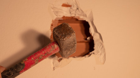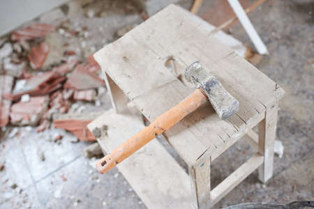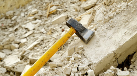 Sledgehammer leaning against a wall partially demolished, surrounded by rubble