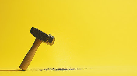 This captivating image features a hammer poised against a vivid yellow backdrop, illustrating dynamic motion with dust particles in the air, evoking creativity and craftsmanship.