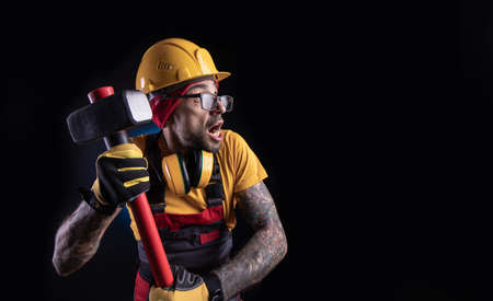 Young builder in a yellow helmet with a large hammer on his shoulder in the room for repair. The concept of construction, repair and communication.